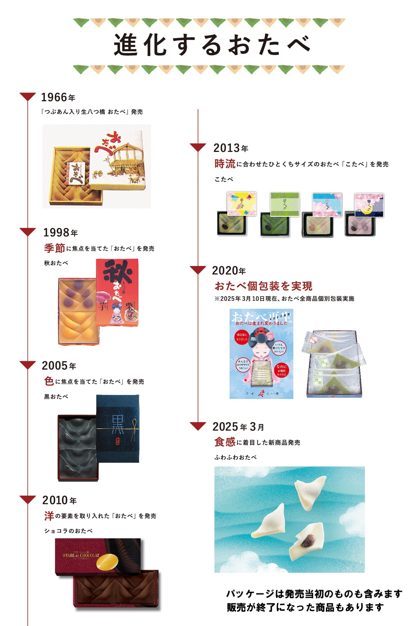 八つ橋といえば硬い焼き菓子か、あるいはシート状の生八つ橋しかなかった昭和41年、生八つ橋でつぶあんを包み、三角形に折った「おたべ」を世に出したのです。