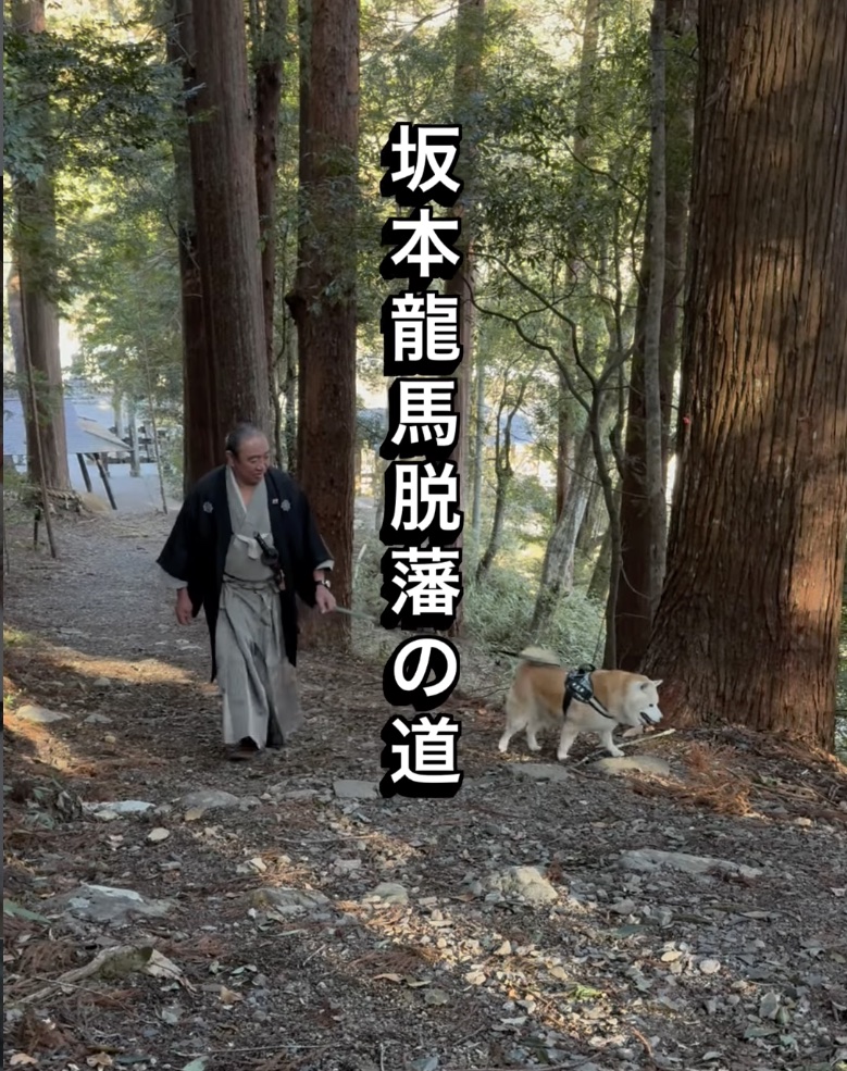 てな訳で、岳は龍馬になりきって梼原町の宣伝活動に勤(いそ)しむおじさんと、梼原脱藩さんぽをしました🐾🐾👣