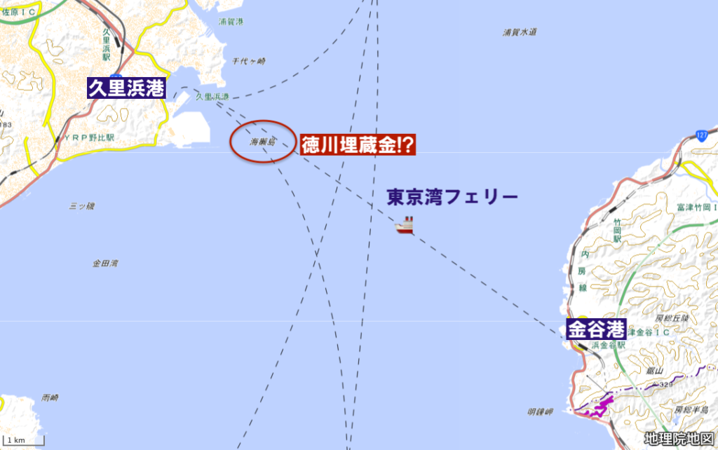 久里浜沖に徳川埋蔵金が沈んでいるなら、久里浜港と金谷港を結ぶ東京湾フェリーは、毎日、埋蔵金の上を航行していることになるのですが・・・。