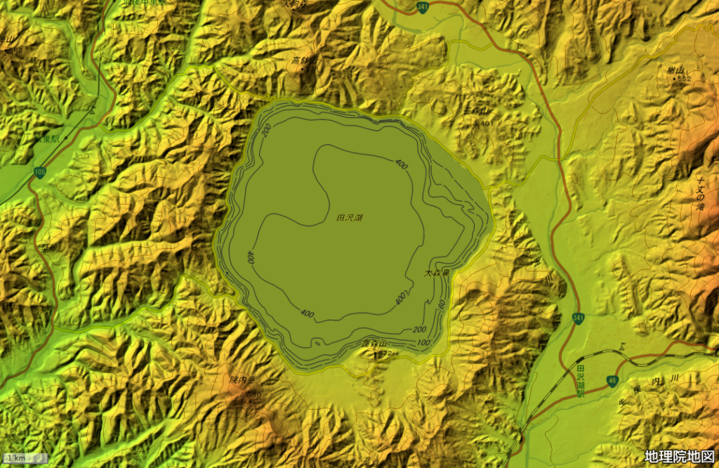 国土地理院では紹介した地図のように、湖底地形を調査し、それを地形図に反映させています(色は標高を反映)